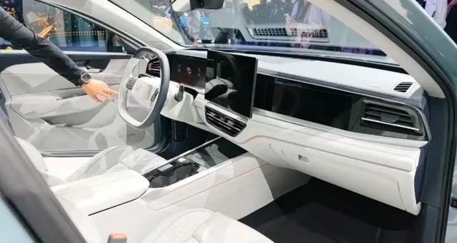 内饰上同样采用了简约设计,上黑下白的风格看起来特别独特,左边是上下双平底两幅式多功能方向盘,并且采用了怀挡设计,给中控扶手箱位置保留了手机无线充电位置,前面是10.25英寸的液晶仪表屏,中间搭载了12英寸的悬浮式中控屏,副驾配备了11.6英寸的娱乐屏,内置了MOS 4.0车机系统,支持语音助手等常见功能,值得注意的是HUD抬头显示功能需要自行选装,不过前排无线手机充电和氛围灯以及座椅电动调节和加热等配置均有配备。