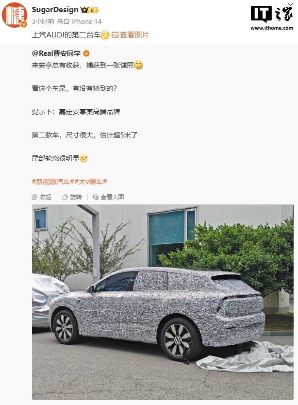 从图上可以看到,这款新车的尾部采用了与 AUDI 品牌首款车型 E5 Sportback 的同款设计,车身侧面配备隐藏式门把手和常规后视镜,爆料源称“尺寸很大,估计超 5 米了”。目前尚不清楚这款新车的具体型号。